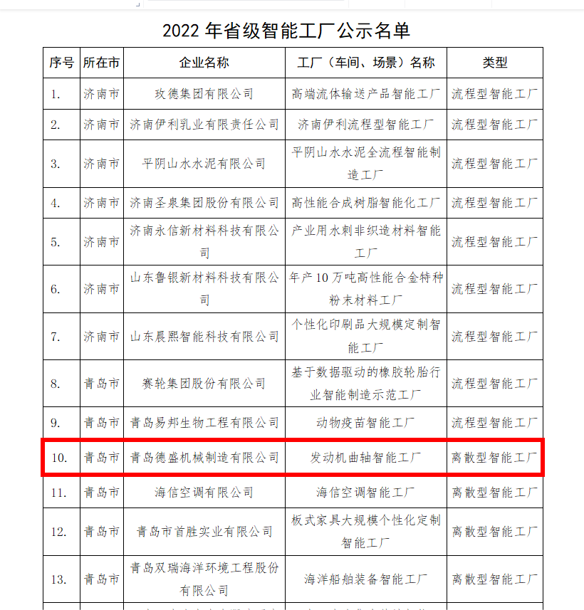 1、近日,山東省工業(yè)和信息化廳公布了2022年山東省級(jí)智能工廠(數(shù)字化車(chē)間場(chǎng)景)名單,我公司成功列入山東省智能工廠。